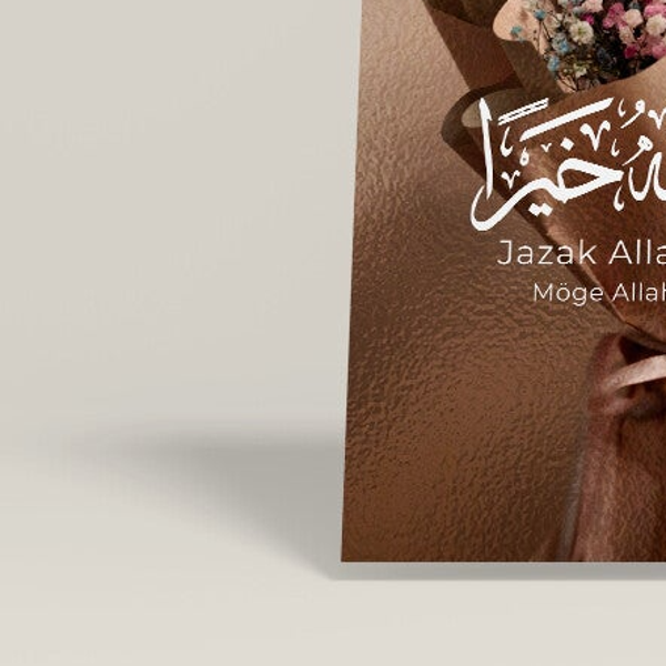 Schenke ein Dankeschön, das tiefer geht als Worte – mit unserer liebevoll gestalteten Karte in sanften Beige- und Brauntönen. Die Aufschrift „Jazakallahu kheir – Möge Allah dich belohnen“ macht sie zu einer besonders wertvollen Geste für jeden Muslim oder jede Muslima, der*die etwas Gutes getan hat.