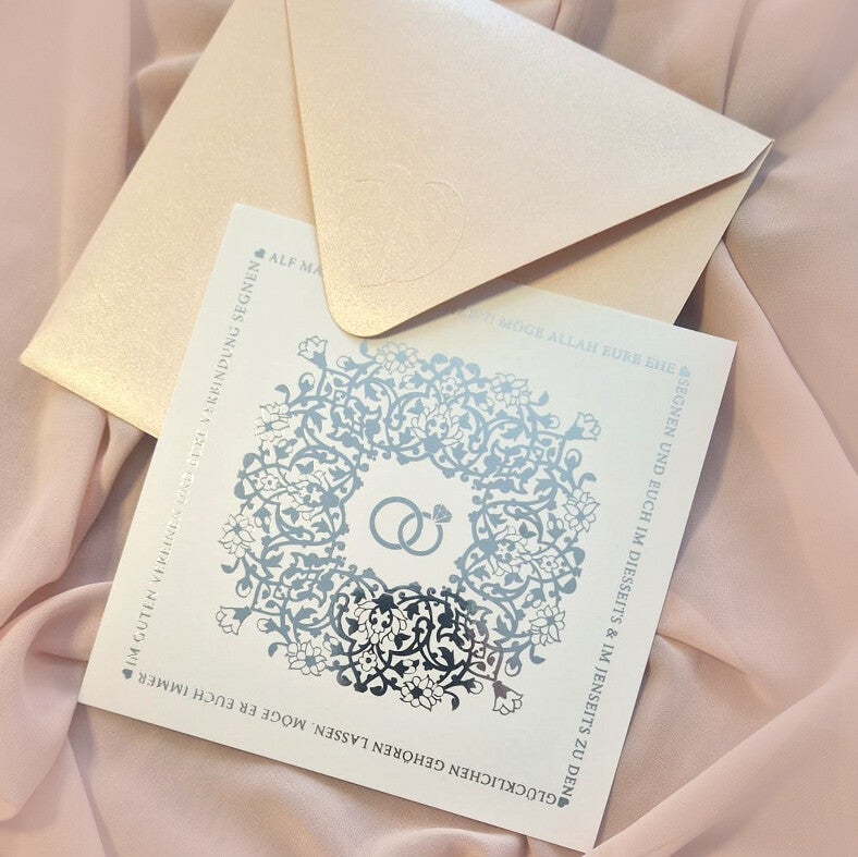 Unsere Edle Hochzeitskarte kommt mit einer Silberprägung und einer Dua für das Brautpaar. Die Rückseite ist beschreibbar.